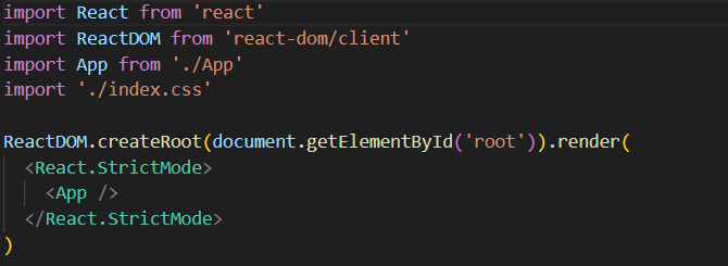 그리고 다시 main.jsx 파일 밑에 보면 ReactDOM에서 createRoot를 호출하는데 그 안을 보면 root라는 ID를 가진 HTML 파일 안의 요소에 접근하는 것이다.