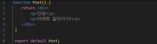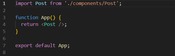 Post.jsx 안에 간단한 HTML코드를 작성 하였다. 이걸 쓴다고해서 출력 화면엔 이게 나오진 않는다 그럼 나오게 설정하려면 어떻게 하면 될까?