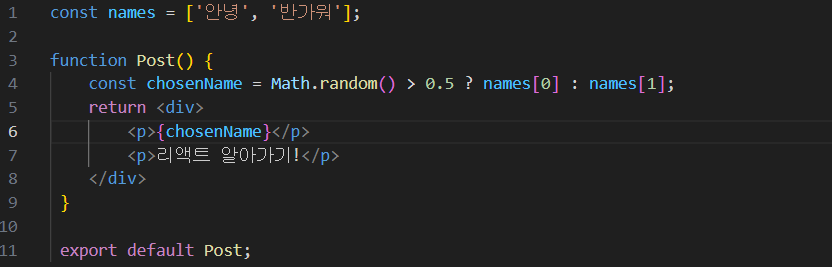 return 위에 chosenName 상수를 추가하여 Math.random 을 이용해서 names 배열의 첫 번째 값, 두 번째 값을 랜덤적으로 출력하는 방법이다.