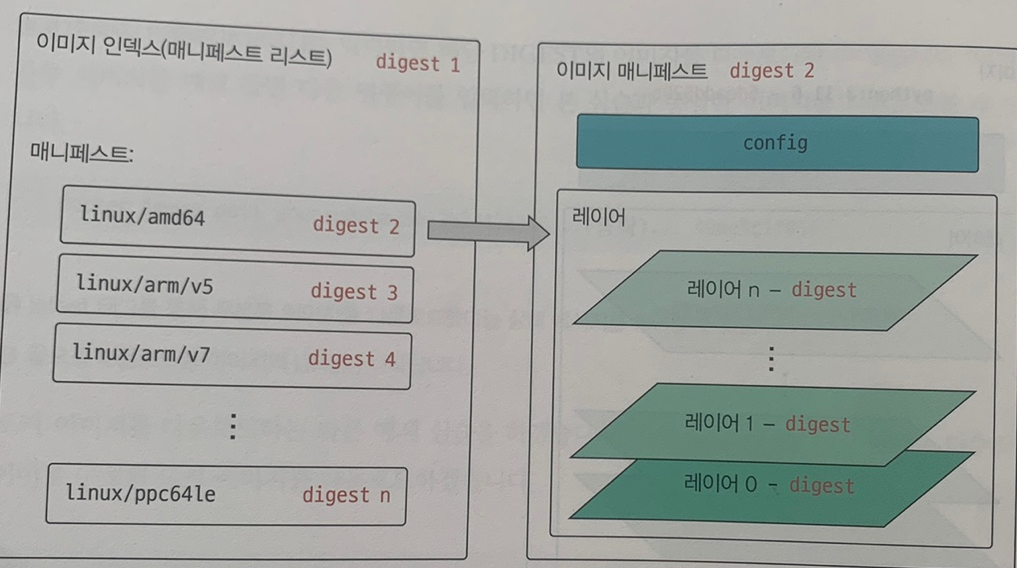 이 이미지 인덱스는 다수의 이미지 매니페스트로 구성되어 있는데 이때 각 이미지 매니페스트는 다양한 운영체제 및 아키텍쳐에서 해당 이미지를 활용할 수 있게 설정한 값과 다양한 레이어들을 제공합니다.