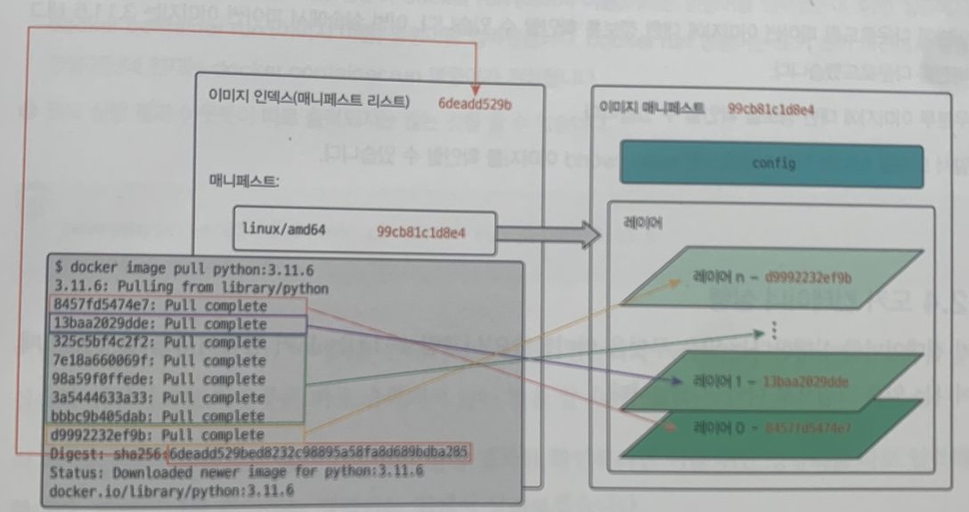 위 사진으로 직접적인 출력 digest 값이 어떤 부분에 해당하는지 연결한 그림입니다. 위 사진을 통해 도커 이미지를 다운로드할 때 어떤 레이어를 다운로드 하는지 확인할 수 있음을 알 수 있습니다.