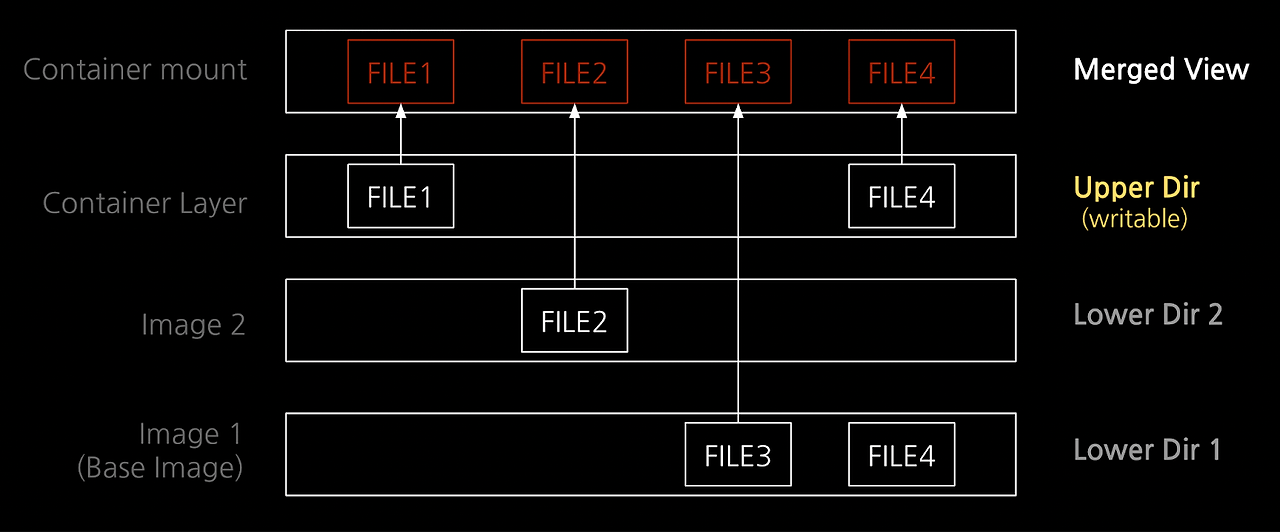 - 이렇게 해서 Lower Dir는 원본 그대로 유지하고, 수정된 내용은 Upper Dir에 기록하게 됩니다.
